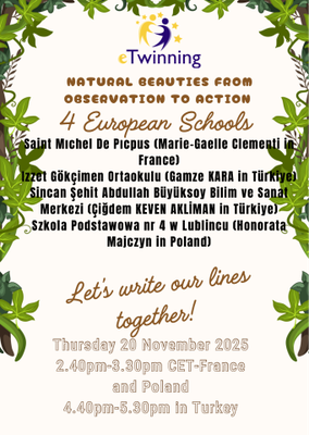 Anglais - Quatrième : "Natural Beauties, from Observation to Action". Visioconférence en anglais avec des élèves polonais et turcs, pour écrire un poème acrostiche au sujet des beautés naturelles et des actions environnementales.
