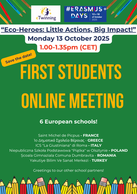 Anglais - Sixème : "Eco-Heroes: Little Actions, Big Impact!". Première visioconférence en anglais avec des élèves grecs, polonais, italiens, roumains et turcs, afin de célébrer les "Erasmus Days", pour se présenter, présenter l'école et discuter de l'écologie.