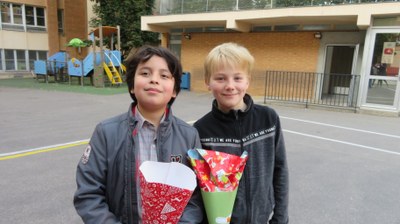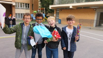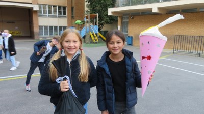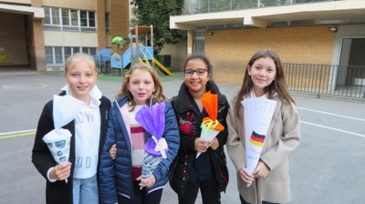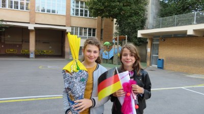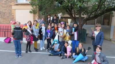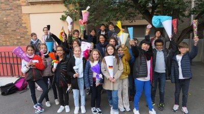 Les élèves germanistes de CM2 ont confectionné et présenté leur propre Schultüte et ont été fiers d'immortaliser leur travail en prenant la pose dans la cour de l'école.